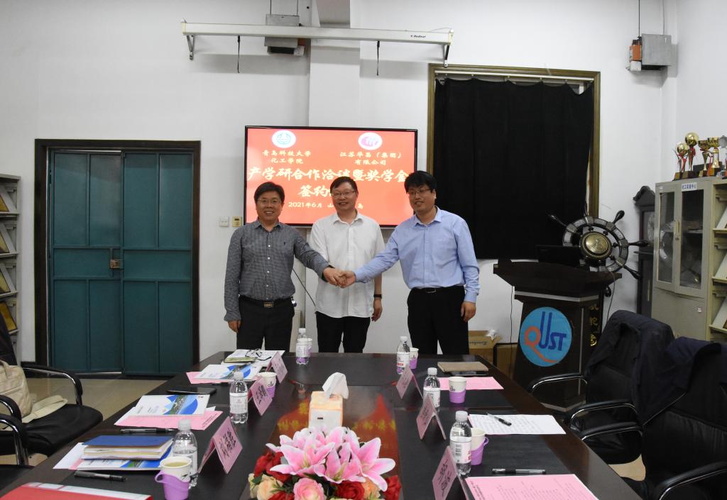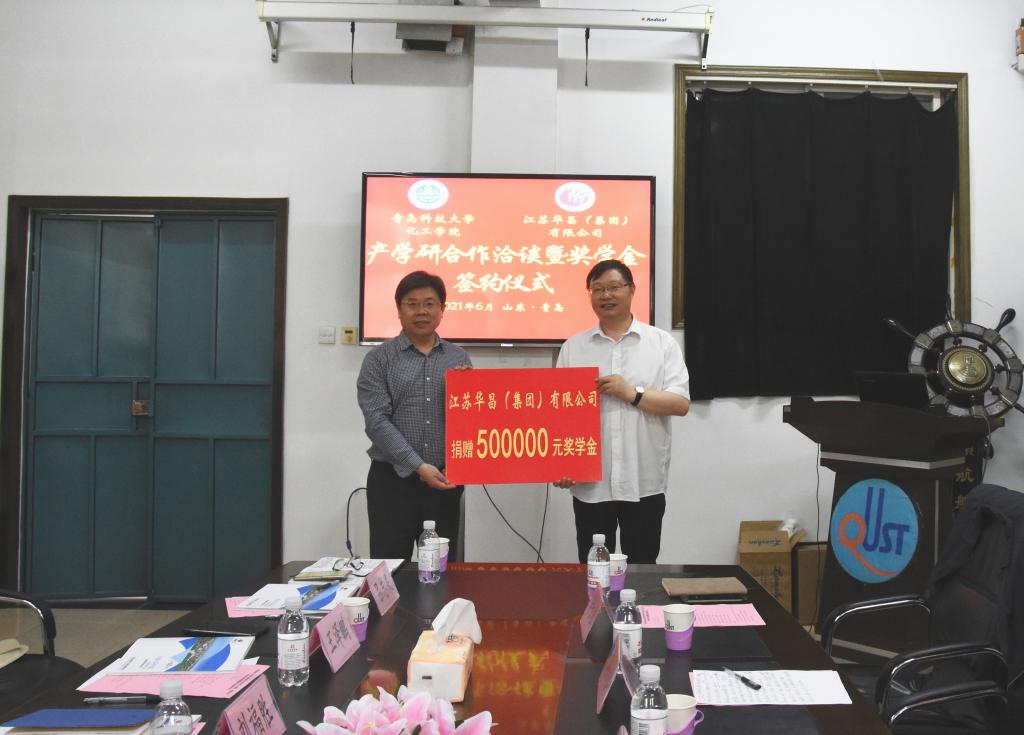 王泽鹏、刘福胜、胡波分别代表校、院、企三方签署《“华昌奖学金”与“华昌体育基金”捐赠协议》。胡波代表公司向化工学院捐赠奖学金。