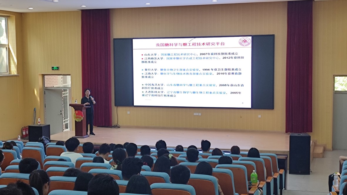 会上,肖敏教授给大家介绍了糖类合成的发展史,以及生活中糖的种类,从生物的角度合成糖类解决天然中无法合成的糖类。结合案例给同学们讲述了糖苷酶的催化合成,用微生物基础之生物合成和生物转化研究,重点开展微生物酶法合成重要药用寡糖、肿瘤相关糖抗原和抗肿瘤药物的糖基化修饰增加靶向性的研究工作。