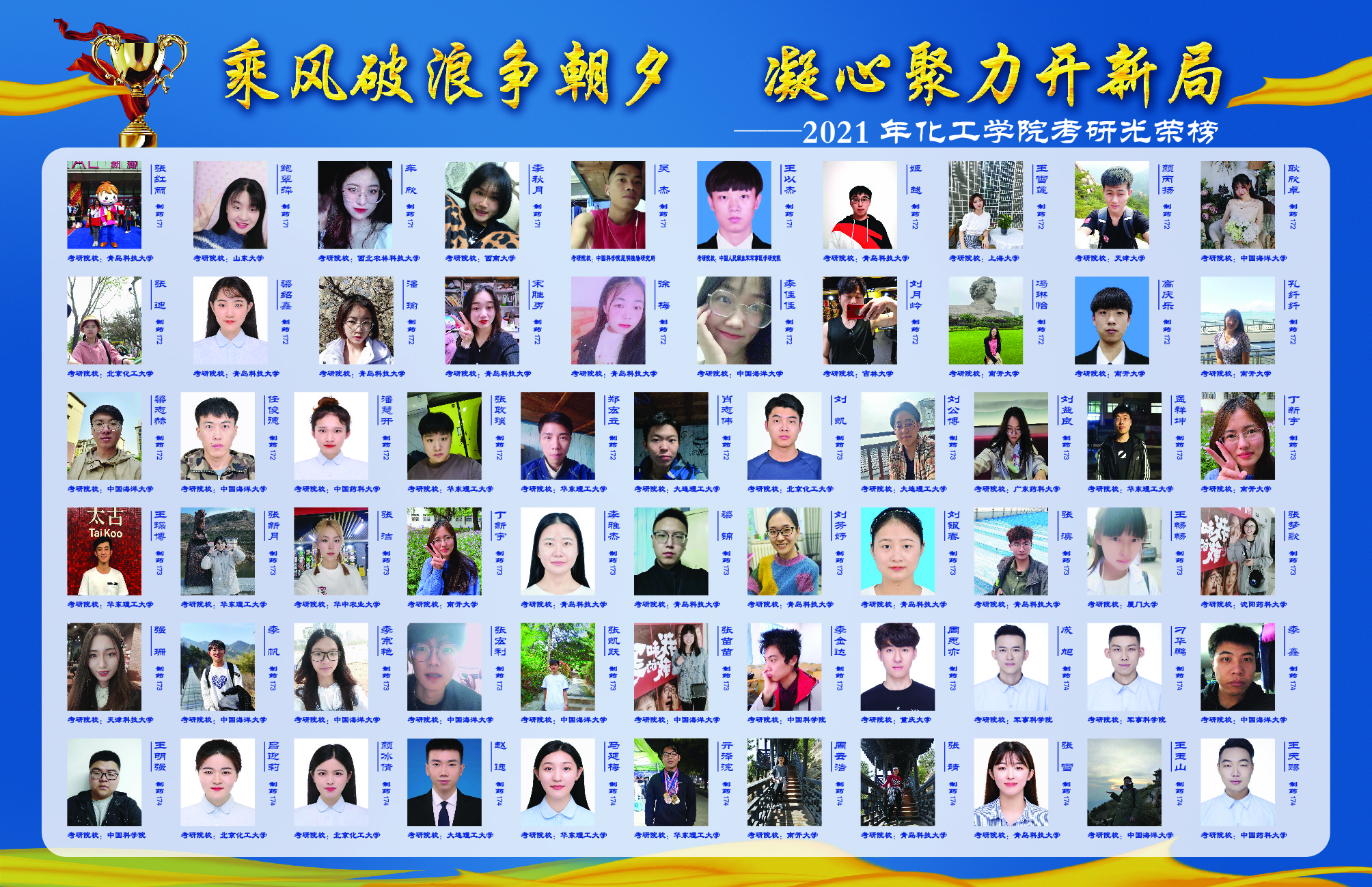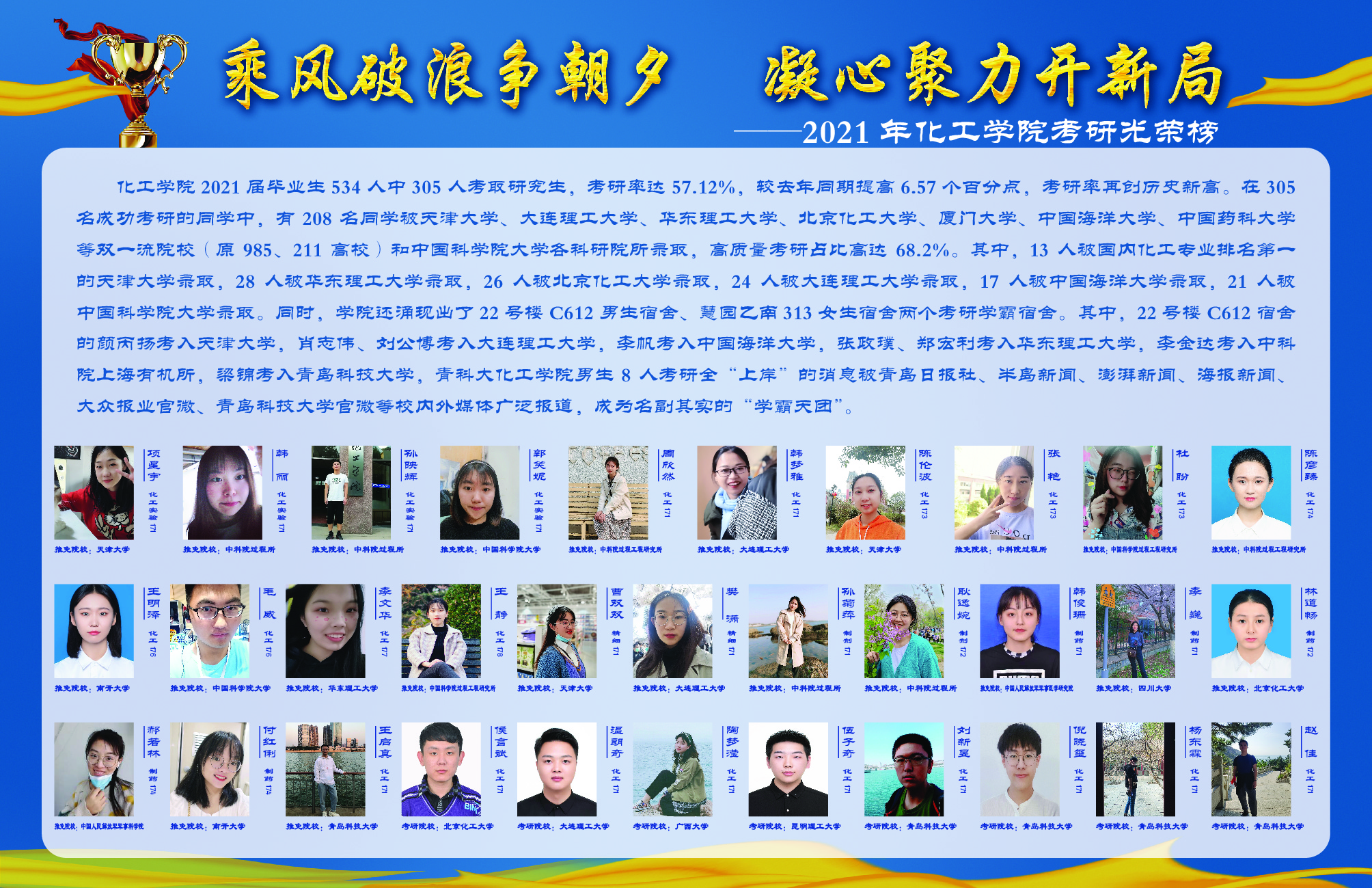化工学院2021届毕业生534人中305人考取研究生,考研率达57.12%,较去年同期提高6.57个百分点,考研率再创历史新高。在305名成功考研的同学中,有208名同学被天津大学、大连理工大学、华东理工大学、北京化工大学、厦门大学、中国海洋大学、中国药科大学等双一流院校(原985、211高校)和中国科学院大学各科研院所录取,高质量考研占比高达68.2%。其中,13人被国内化工专业排名第一的天津大学录取,28人被华东理工大学录取,26人被北京化工大学录取,24人被大连理工大学录取,17人被中国海洋大学录取,21人被中国科学院大学录取。同时,学院还涌现出了22号楼C612男生宿舍、慧园乙南313女生宿舍两个考研学霸宿舍。其中,22号楼C612宿舍的颜丙扬考入天津大学,肖志伟、刘公博考入大连理工大学,李帆考入中国海洋大学,张政璞、郑宏利考入华东理工大学,李金达考入中科院上海有机所,梁锦考入771771威尼斯cm大全,青科大化工学院男生8人考研全“上岸”的消息被青岛日报社、半岛新闻、澎湃新闻、海报新闻、大众报业官微、771771威尼斯cm大全官微等校内外媒体广泛报道,成为名副其实的“学霸天团”。