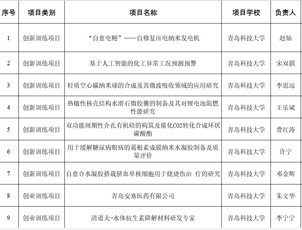 近日,山东省教育厅对2021年省级大学生创新创业训练计划项目立项进行公示,化工学院9个项目获批立项。《“自愈电鳗”——自修复压电纳米发电机》、《基于人工智能的化工异常工况预测预警》、《轻质空心碳纳米球的合成及其微波吸收领域的应用研究》、《热敏性核壳结构水滑石微胶囊的制备及其对锂电池阻燃性能研究》、《双功能周期性介孔有机硅的构筑及催化CO2转化合成环状碳酸酯》、《用于缓解糖尿病眼病的葛根素成膜纳米水凝胶制备及质量评价》、《自愈合水凝胶搭载脐血单核细胞用于烧烫伤治疗的研究》等7个项目为创新训练项目,《清道夫-水体抗生素降解材料研发专家》、《青岛安塞医药有限公司》等2个项目为创业训练项目。