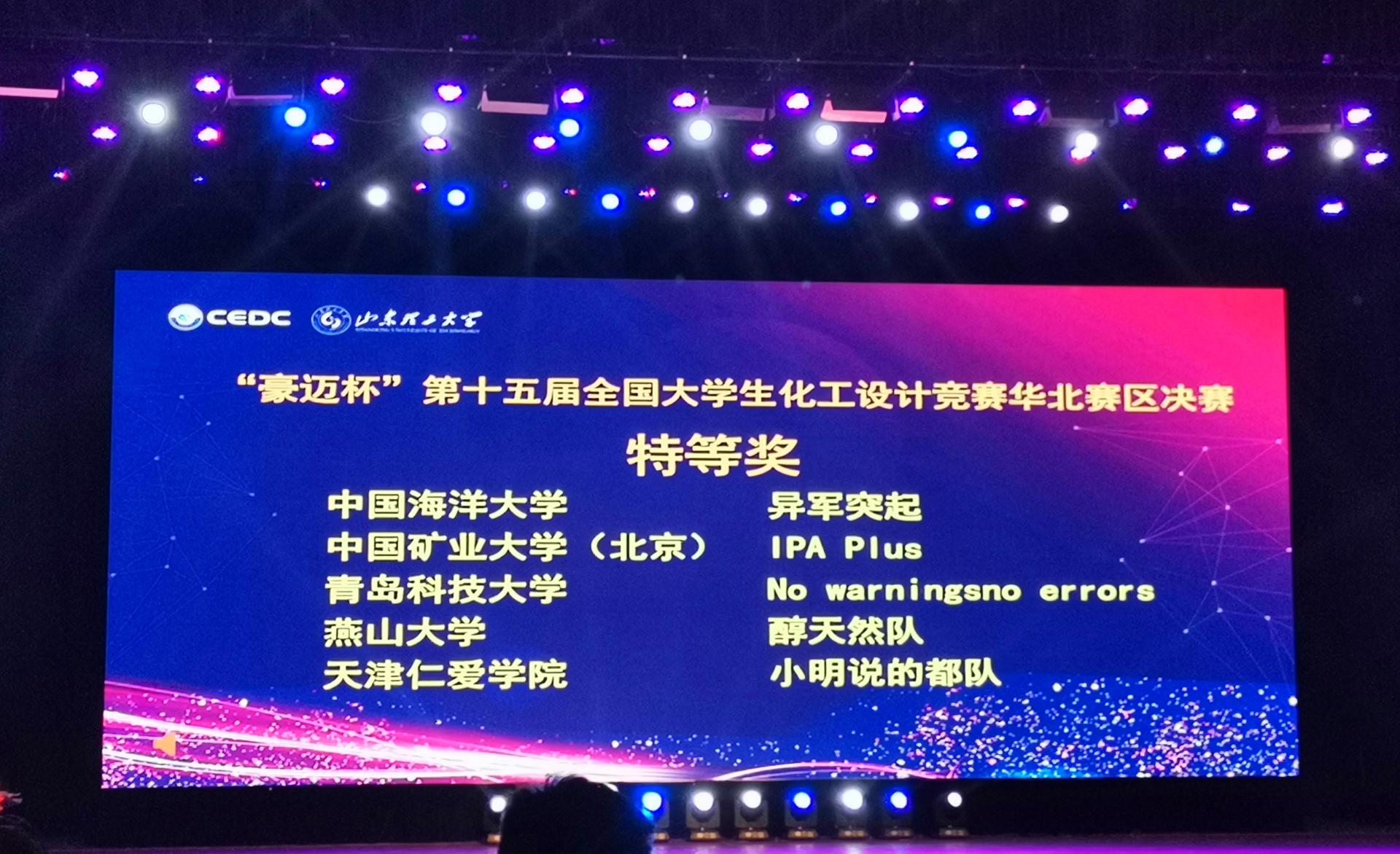 7月31日-8月1日,由教育部高等学校化学工程与工艺专业教学指导分委员会、中国化工学会、中国化工教育协会主办的第十五届全国大学生化工设计竞赛华北赛区决赛在山东理工大学举行。771771威尼斯cm大全化学工程与工艺2018级学生孙瑞、孙萌娅、迟淑秀、李宁宁、刘新春组成的“No warnings, no errors”团队从73支参赛队伍中脱颖而出,获得华北赛区特等奖,并晋级全国总决赛。2018级学生栾传宝、顾兴龙、赵 灿、李克旭、徐珍同学组成的“V Smile”团队获得华北赛区一等奖。771771威尼斯cm大全参赛队伍由化工学院党委副书记孙明媚带队,孙晓岩、夏力、田文德、王传兴、陈秋阳等担任指导老师。