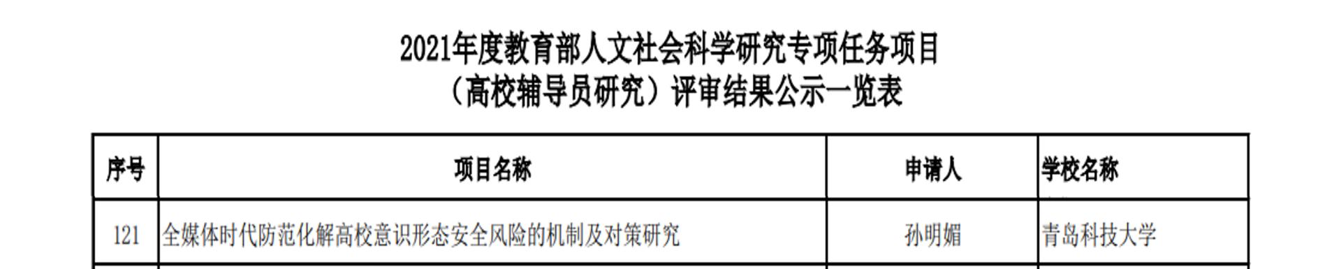 近日,教育部社科司发布《关于2021年度教育部人文社会科学研究一般项目评审结果的公示》,化工学院党委副书记孙明媚申报的《全媒体时代防范化解高校意识形态安全风险的机制及对策研究》项目获立项公示。这是学院首次在该项目中获得立项资助,实现了学院在此科研项目零的突破!