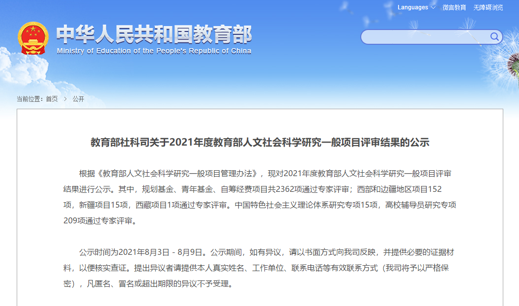 据悉,根据《教育部人文社会科学研究一般项目管理办法》,申报课题立足“两个一百年”历史交汇点,以研究回答新发展阶段重大理论与现实问题为主攻方向,体现鲜明的时代特征、问题导向和创新意识。2021年度教育部人文社会科学研究高校辅导员研究专项209项通过专家评审。