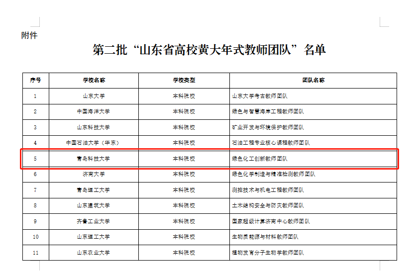 近日,山东省教育厅发布《关于公布第二批“山东省高校黄大年式教师团队”名单的通知》(鲁教师函[2021]35号),771771威尼斯cm大全李志波教授领衔的绿色化工创新教师团队成功入选,并被省教育厅推荐参评第二批“全国高校黄大年式教师团队”。