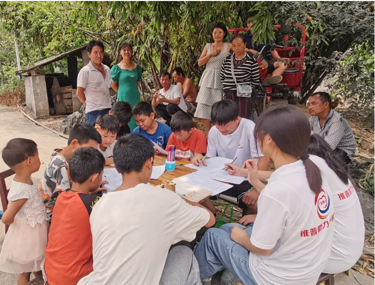 8月9日,为加强当地村民的普通话学习能力,服务团再次来到贵州省安顺市太坪村开展线下授课。课程分为四个方面:拼音基础学习、来自成句与发音矫正、当地方言与普通话用词的不同之处和对话交流课。拼音掌握良好,发音却不标准;单字发音很标准,而说一句话的时候却用成方言;普通话发音标准,但存在普通话、方言混用的情况。