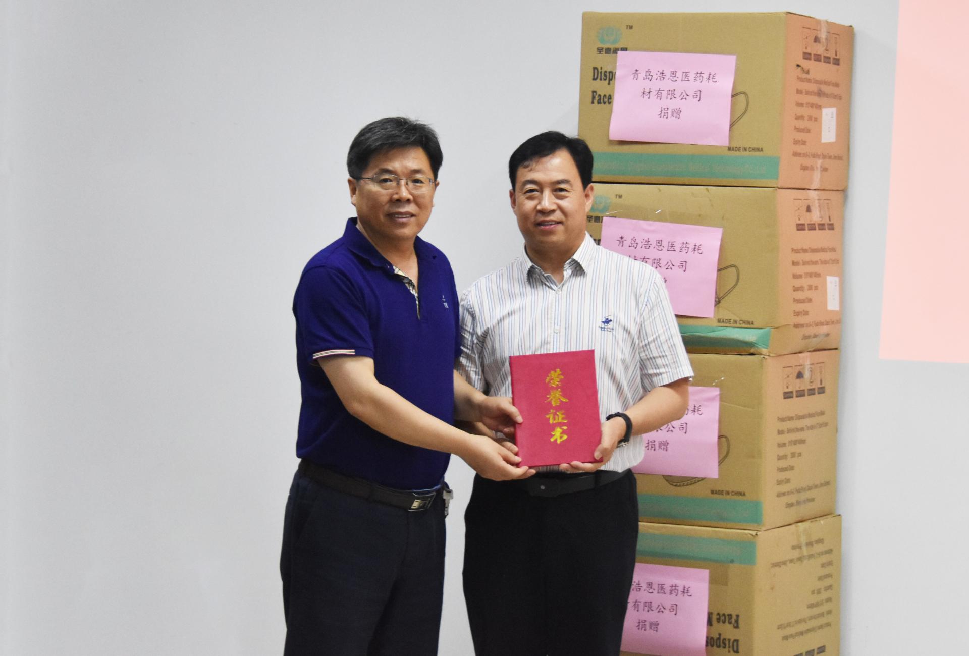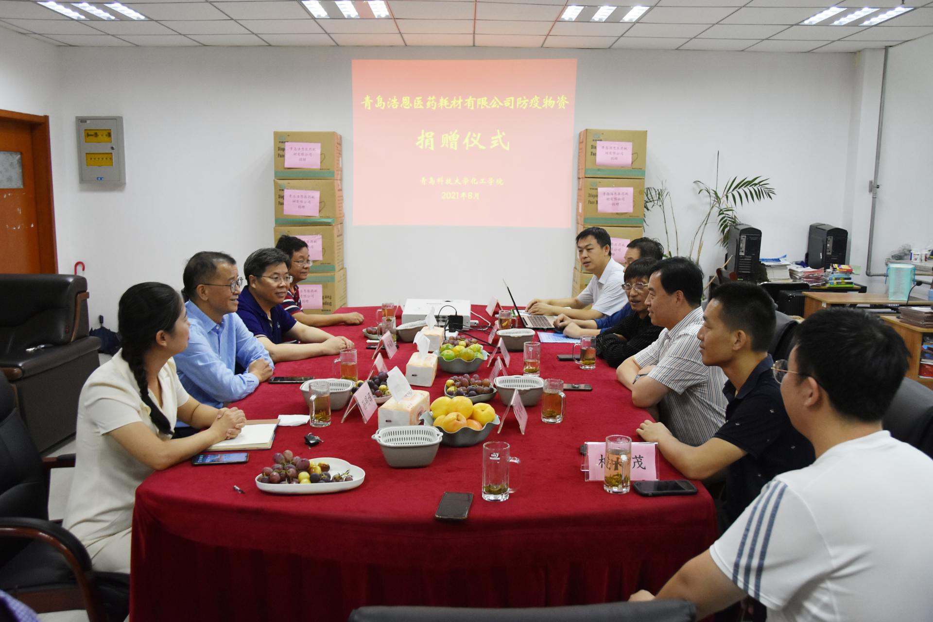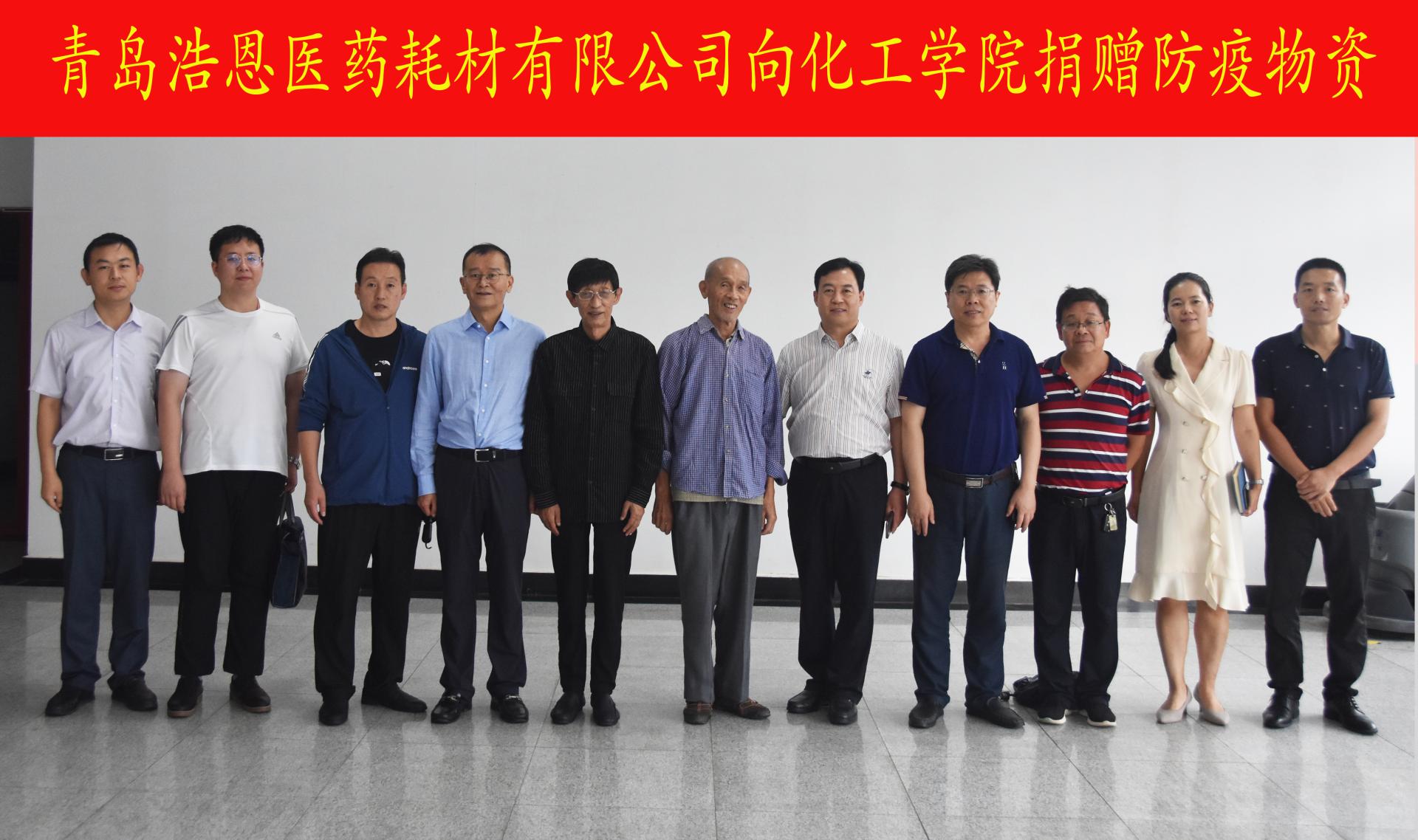同舟共济扬帆起,乘风破浪万里航。8月31日,青岛浩恩医药耗材有限公司向化工学院捐赠口罩50箱(共计100000只),用实际行动支持化工学院疫情防控工作,助力师生平安复学。青岛浩恩医药耗材有限公司董事长黄克兴、总经理刘玉峰将这批防疫物资运送到学院,化工学院党政领导刘福胜、钱翌、孙明媚接见了黄克兴一行,教师代表唐林生、秦洪庆、耿赛参加。