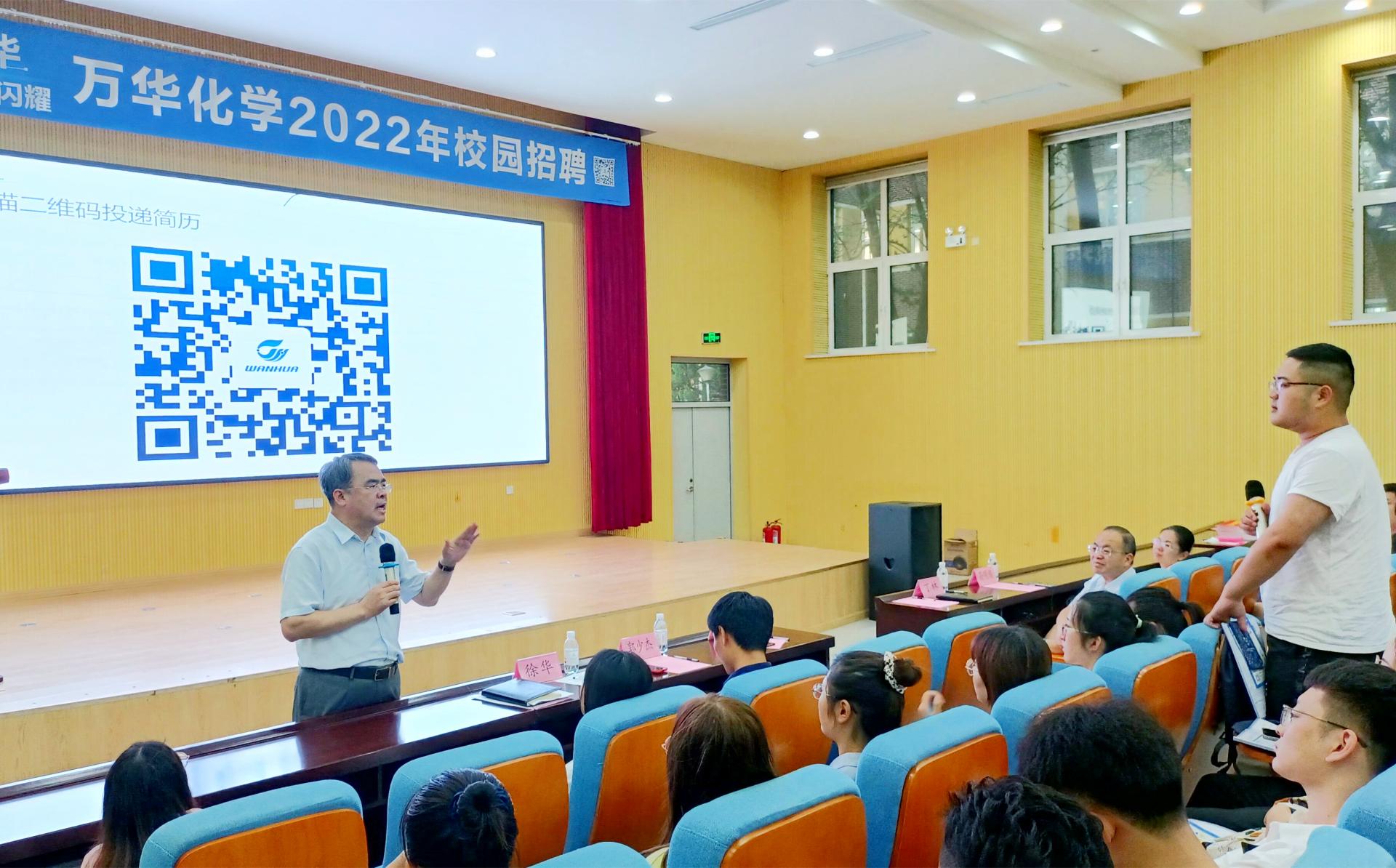 仪式后,万华化学进行2022校园招聘全国高校首场宣讲会,来自四方、崂山、高密三个校区的600余名毕业生参加。赵继德强调,万华化学始终将人才作为公司的第一核心战略资源来培养,为每位员工提供职业与专业导师,帮助员工进行职业规划,尽快熟悉工作,他与在场学生积极交流并耐心回答了大家关注的问题。万华化学招聘经理井雨微女士从万华化学的员工培训成长体系出发,详细介绍了万华化学的企业文化、薪酬政策、员工福利、发展机遇等方面的内容,她讲到公司成立了“万华大学”,为员工提供通用技术、岗位技能、管理与领导力等方面的培训,方便员工进行“自我充电”,不断发掘自身潜能。