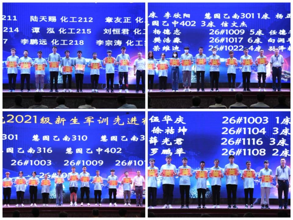 党委副书记孙明媚宣读了《关于表彰化工学院2021级新生军训先进集体和优秀个人的决定》,与会领导、老师为获奖的集体和个人颁发了奖状。