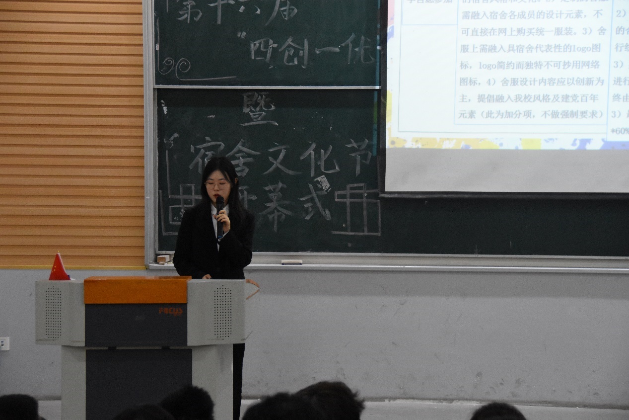 首先,化工学院学生会生活部副部王日萍对于“四创一优”建设和宿舍文化节活动进行了详细的介绍,讲解了“四创一优”宿舍考评标准及奖励方法,动员同学们参加宿舍舍服设计大赛、宿舍风采大赛、宿舍设计大赛。接下来,生活部副部杨浩敏宣读了“四创一优”倡议书,她提到“以心灵之魂,换宿舍之美”,倡导同学们把极大的热情投入到共建“四创一优”文明宿舍的行动中,推进宿舍创新,为营造和谐优质的校园作出贡献。最后,化工学院学生会生活部部长季辉总结,他指出一个宿舍就是一个世界,一个宿舍就是一个家庭。一个团结友爱、积极向上的宿舍风气对于大学生学习、发展、就业、成才有着深远的意义。