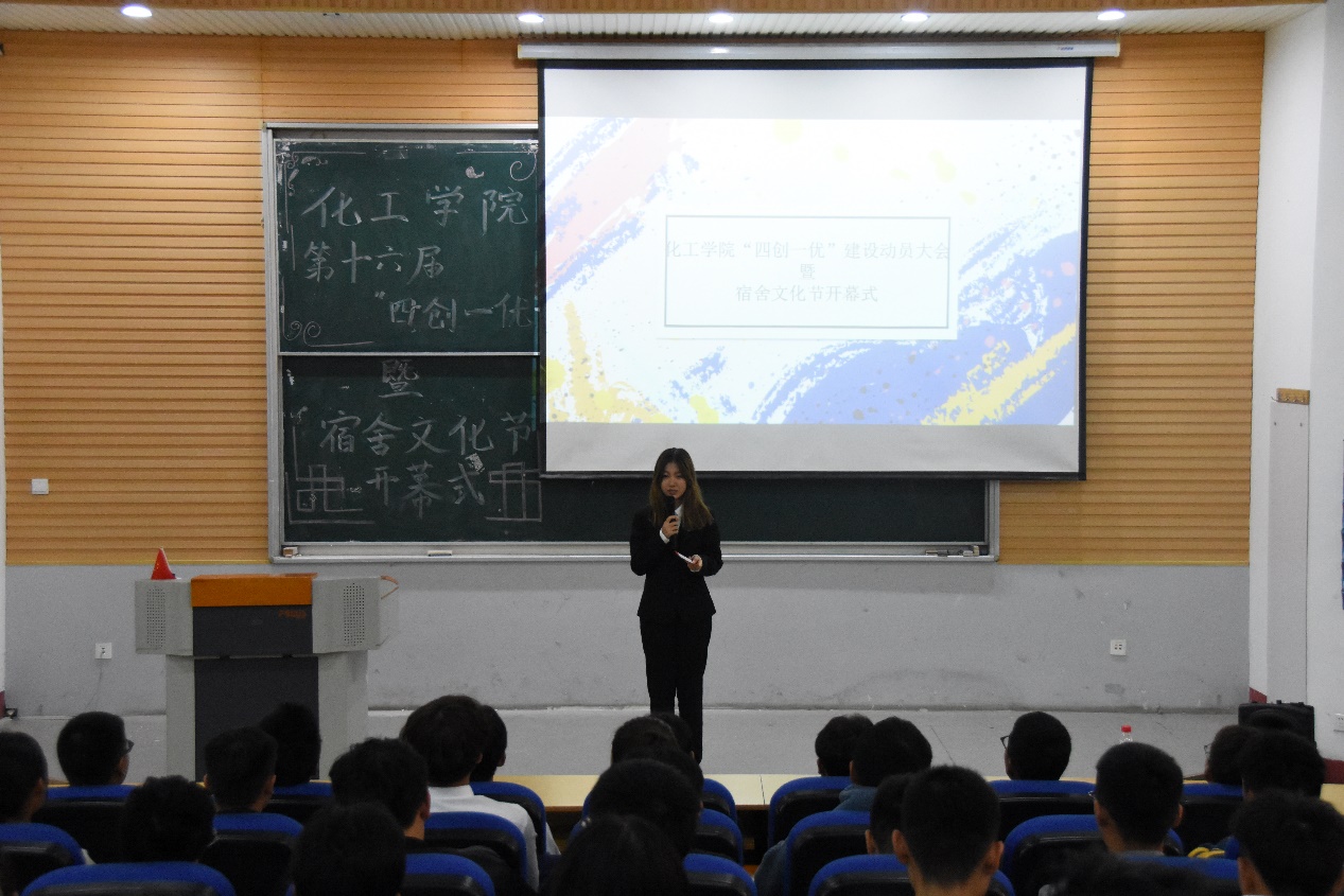 10月12日下午1:30,化工学院第十六届“四创一优”建设动员大会暨宿舍文化节开幕式在第二教学楼101教室隆重举行。化工学院学生会生活部部长季辉及生活部干事,2020级、2021级舍长参加了本次活动。本次活动由邵琳雁主持。
