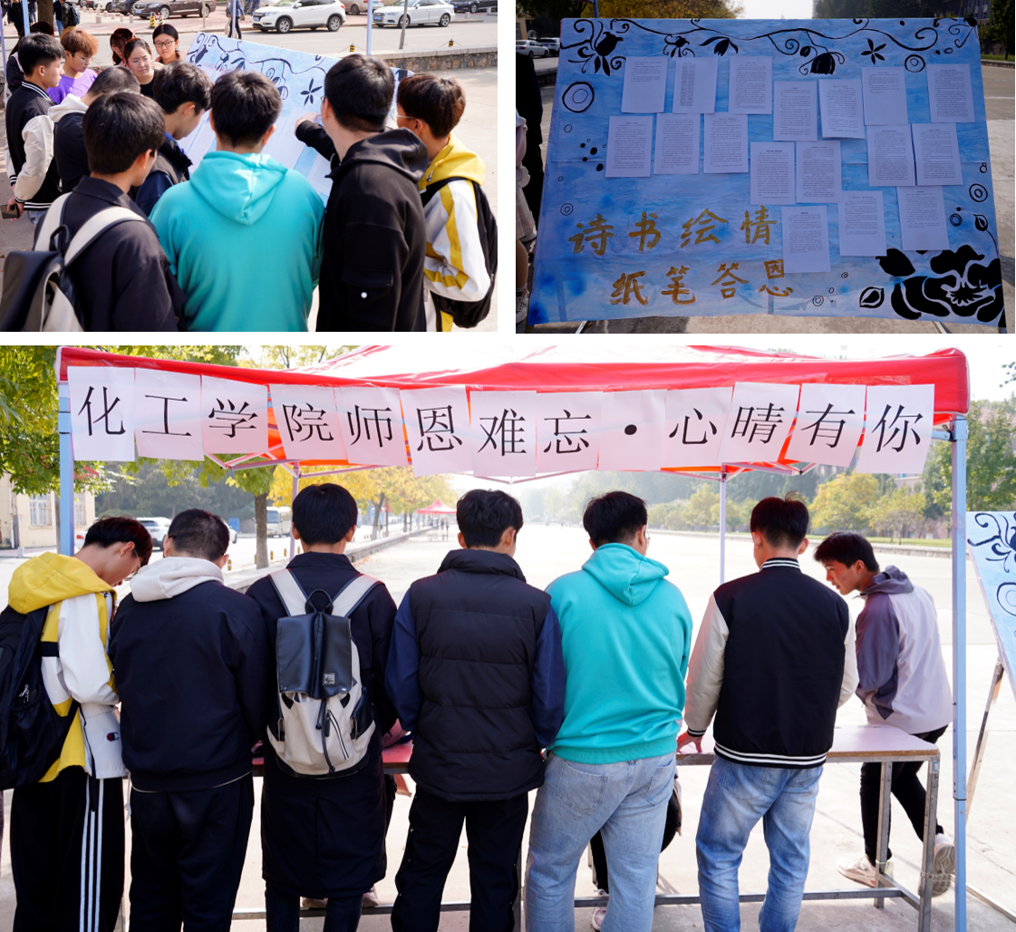 诗书绘情,纸笔答恩。10月24日上午,化工学院在小五四广场展出同学们的征文和绘画作品。同学们用笔墨绘出诚挚敬重、写出浓情蜜意,真挚地表达出学生对老师难以言表的感激和敬爱之情。朗朗上口的诗歌,饱含深情的文章,色彩艳丽的画作给深秋的青科大平添了不少温情。