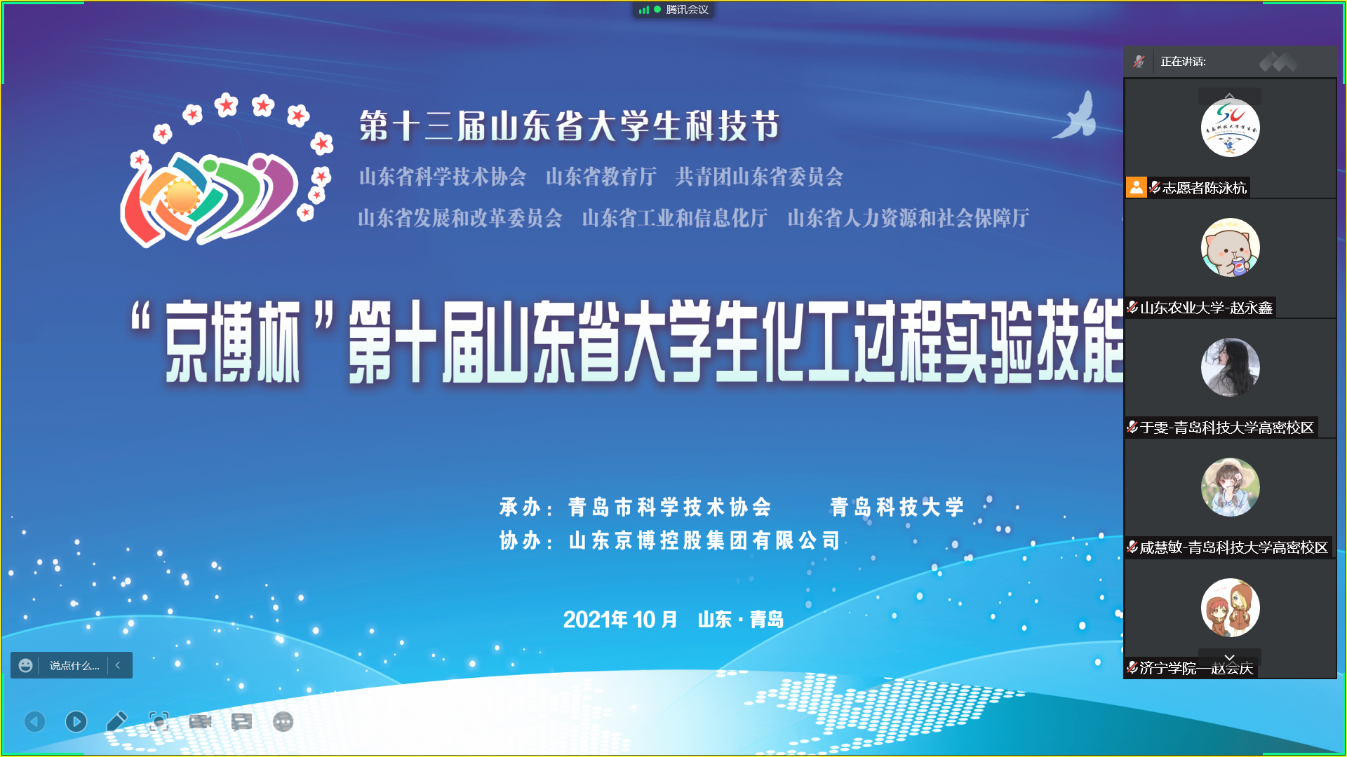 近日,由省科协、省教育厅、团省委、省发改委、省工信厅、省人社厅主办,青岛市科协、771771威尼斯cm大全、天津大学承办,山东京博控股集团有限公司协办的“京博杯”第十届山东省大学生化工过程实验技能竞赛在771771威尼斯cm大全(线上)举行,来自中国海洋大学、中国石油大学(华东)、山东科技大学、山东理工大学、771771威尼斯cm大全等省内26所普通本科高校的417支队伍参加比赛。