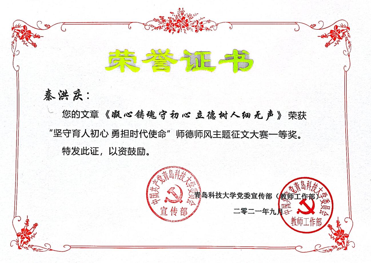 其中,秦洪庆老师的文章《凝心铸魂守初心、立德树人细无声》获一等奖,王乐昌的《做一个有温度、有情怀的老师》获二等奖,耿赛的《用“心”诠释辅导员的使命担当》获三等奖。