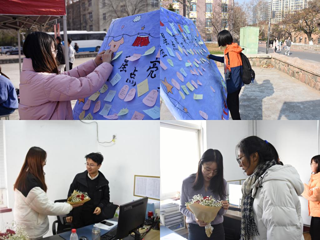 此次活动面向四方校区全体师生,活动分别由“感恩合拍”、“回忆影集”、“礼献教职工”、“让感恩发声”和“三行家书”五个小活动组成。参与者都可以领取一枝鲜花,赠予自己最喜欢的教职工,并且进行感恩合拍。收集与辅导员老师的合影,制作影集赠予老师留作纪念。活动现场放置了感恩恩师的展板,路过的同学可以在便利贴上写下自己感恩的话语,以懂你为名,让感恩发声。