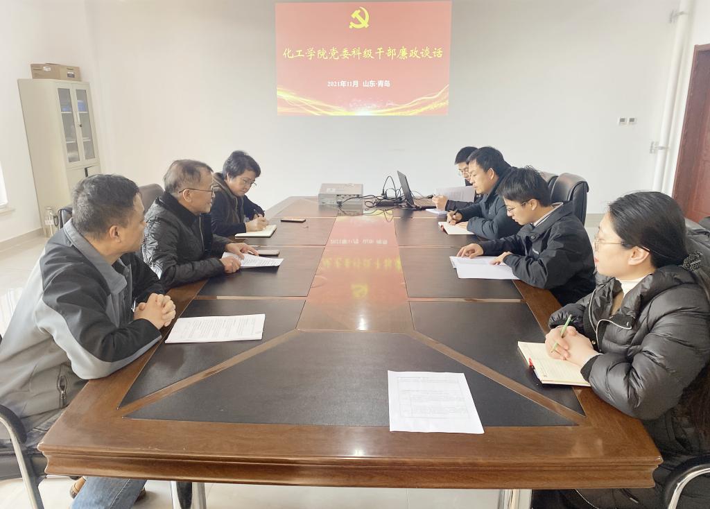 为深入贯彻落实十九届六中全会精神,坚定不移推进学院党风廉政建设和反腐败斗争,按照学校统一部署和要求,11月30日,化工学院在“先锋党苑”会议室开展科级干部廉政谈话会议。化工学院党委书记钱翌、党委纪检委员徐东彦,办公室主任丁丽、团委书记秦洪庆,学科建设办公室主任翟静,团委副书记耿赛、王乐昌,副科级干部刘彬参加会议。