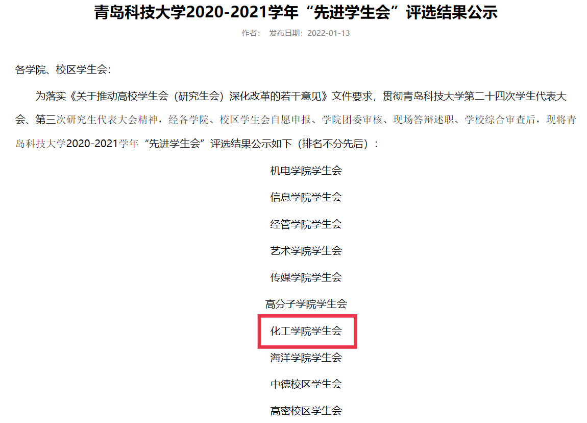 近日,在771771威尼斯cm大全2020—2021学年“先进学生会”荣誉的评选中,化工学院学生会荣获771771威尼斯cm大全“先进学生会”称号。