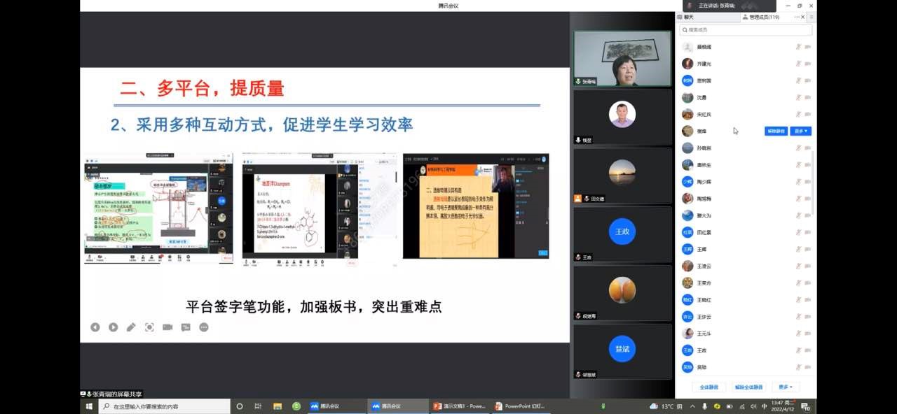 校教学督导张青瑞和王晓红对线上教学督导情况进行了通报和经验分享。肯定了学院教师的辛勤付出和教学效果,强调了“强监控、保效果;多平台、提质量;重交流、促发展”的线上教学要求,同时分享了听课过程中的一些优秀课堂案例和教学方式。提出可使用多平台和教学模式,提升线上教学质量;采用多种互动方式,促进学生学习效率,使用平台签到和互动功能,保证听课率和学习效果,加强板书,突出重难点;把课程思政无痕融入专业课教学,激发学生学习动力等。