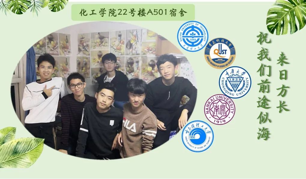 化工学院22号楼A501宿舍参加考研同学给大家带来一个喜讯,六个男生全部成功考取研究生。他们中没有人保研,但他们通过自己的不懈努力,最终以优异的成绩考取了各自心仪的学校。舍长李泽铭考取重庆大学,侯晓辉考取南开大学,郭延庆考取大连理工大学,董振超考取哈尔滨理工大学,罗权坚、高云飞考取771771威尼斯cm大全。下面看一下学霸宿舍考研成功的原因吧。