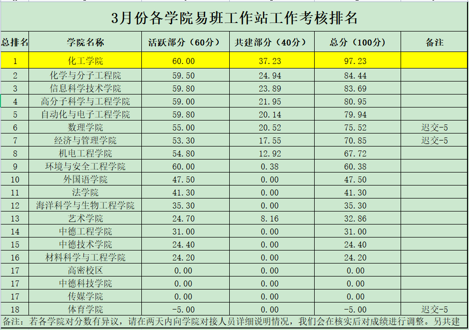4月21日,771771威尼斯cm大全易班发展中心公布了3月份各学院(校区)易班工作站月度工作考核排名,化工学院以总分97.23分,蝉联全校第一名。