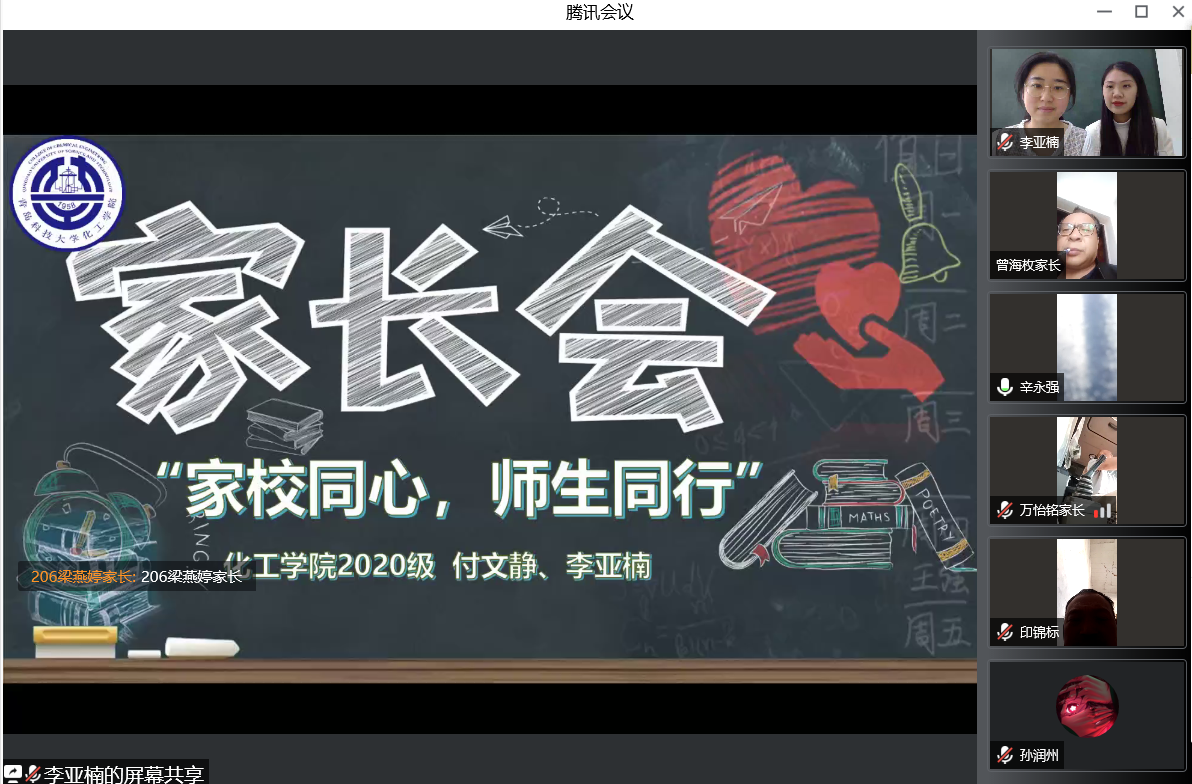 为进一步促进家校联动,将家庭教育与学校教育有机融合,加强学校—家庭、教师—家长之间的沟通交流,5月4日下午,化工学院2020级开展“家校同心,师生同行”主题家长会。辅导员付文静、李亚楠及2020级学生家长通过腾讯会议线上参会。