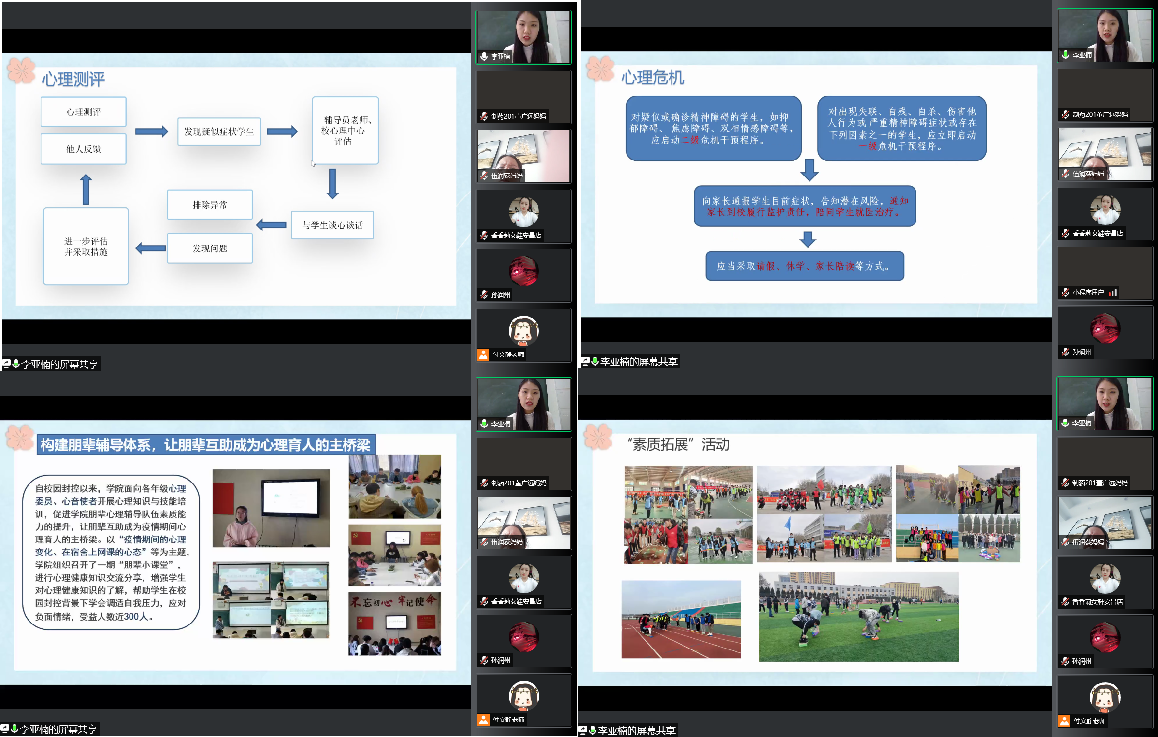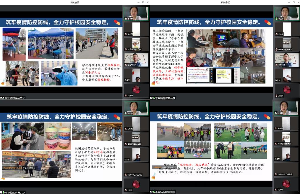 会上,辅导员老师就当前疫情防控要求、学风建设情况、学生心理健康教育等方面向家长们进行了详细的讲解。付文静结合当前疫情形势和最新的防控政策、院校在疫情期间的各类管理服务保障工作、为充实学生在校生活而特别组织的系列活动等做了详细介绍。根据上级疫情防控工作部署,学校实施了科学精准的防控措施,学院全力筑牢疫情防控防线,为确保校园安全和正常教育教学,学院领导、辅导员等疫情防控及生活服务保障人员克服各种困难全时驻校值守,压紧压实防控责任,学校持续开展免费核酸检测,保障学生平安健康,线上教学期间学生学习情况高效有序,稳中有进,学院高度重视心理疏导和人文关怀,组织了各类喜闻乐见的校园活动,发挥心理育人功能。同时,付文静通报了近期学生的学习、生活情况和存在的问题,呼吁家长们及时关注学生动态,共同做好学生思想和日常管理工作,强化亲子关系、监督学业、鼓励运动,齐心协力共同战胜疫情。李亚楠围绕学生心理健康教育为家长讲解了学校心理测评的相关工作、常见的学生心理危机预防和干预措施,为家长介绍了近期学院面向心理委员、心音使者开展的多样化的心理知识与技能培训、学生“朋辈小课堂”心理健康知识交流分享以及“减压广场舞”、“篮球友谊赛”、“五公里健康跑”等素质拓展活动,帮助学生学会调适自我压力,应对负面情绪,希望家长时刻关心孩子心理健康,关注孩子各方面变化,并与辅导员老师及时沟通交流。