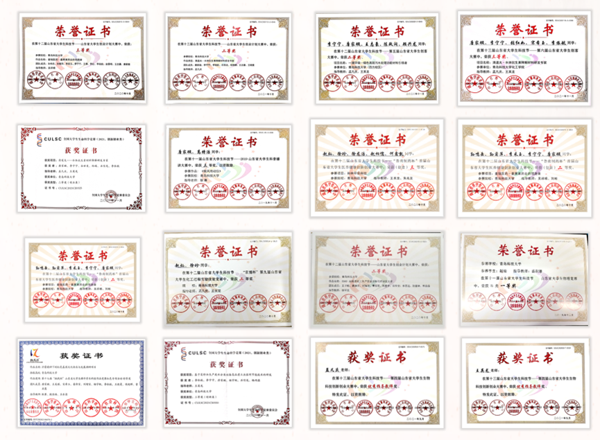 谈到创新创业和学科竞赛,慧园乙北304宿舍更是硕果累累。宿舍六人都积极参与实验课题,进入实验室展开科研工作,累计投出SCI论文3篇,中文核心1篇。她们积极参与科创比赛,互联网+大学生创新创业大赛、“挑战杯”山东省大学生创业计划竞赛、大学生创新创业训练计划、三创赛以及数十项山东省科技节赛事上,都留下了她们奋斗和获奖的身影,累计获得国家级奖励15项,省级奖励58项。李宁宁认为:“实验室的工作虽然枯燥,却有着无限的魅力,虽然过程很辛苦,但是与队友团结协作完成项目的瞬间,那份喜悦是毕生难忘的。在推免复试问答的环节中,各类科创获奖经历也成为了我的亮点,给自己增加了很大的竞争力。”