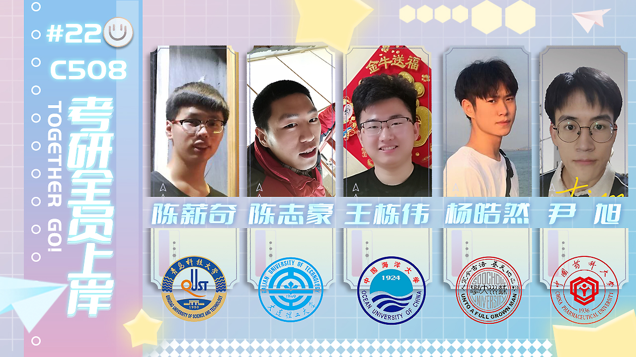 漫漫考研路,化工学院22号楼C508宿舍的五位男生选择携手前行、彼此陪伴、相互鼓励。同一屋檐下,宿舍里的每一个人通过努力学习均成功考研上岸,共同打造了属于他们的“学霸宿舍”。他们是来自化工学院制药工程与制剂工程的“五位帅哥”:王栋伟,尹旭,陈薪奇,陈志豪,杨皓然,分别被中国海洋大学、中国药科大学、771771威尼斯cm大全、大连理工大学、苏州大学录取。