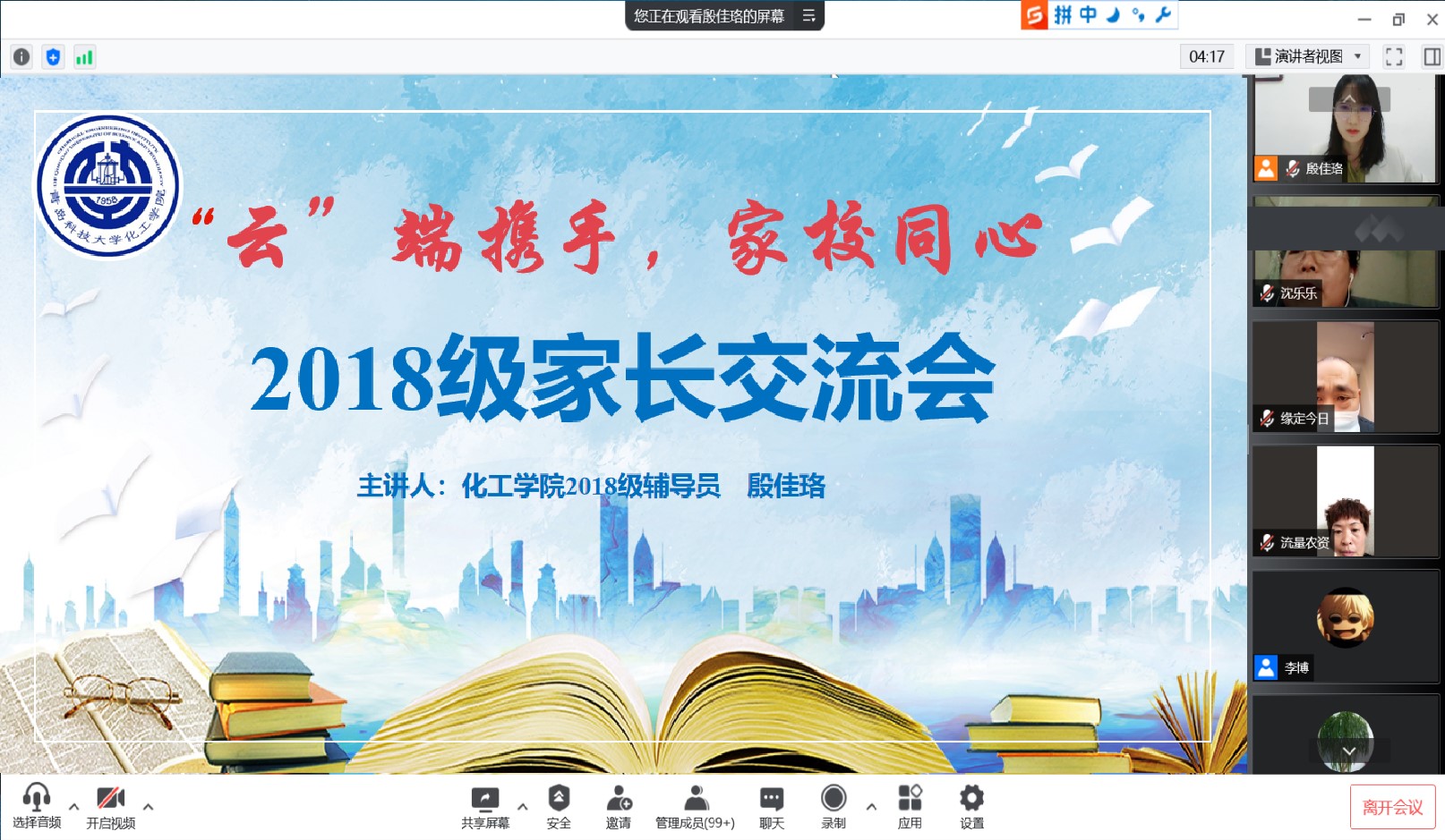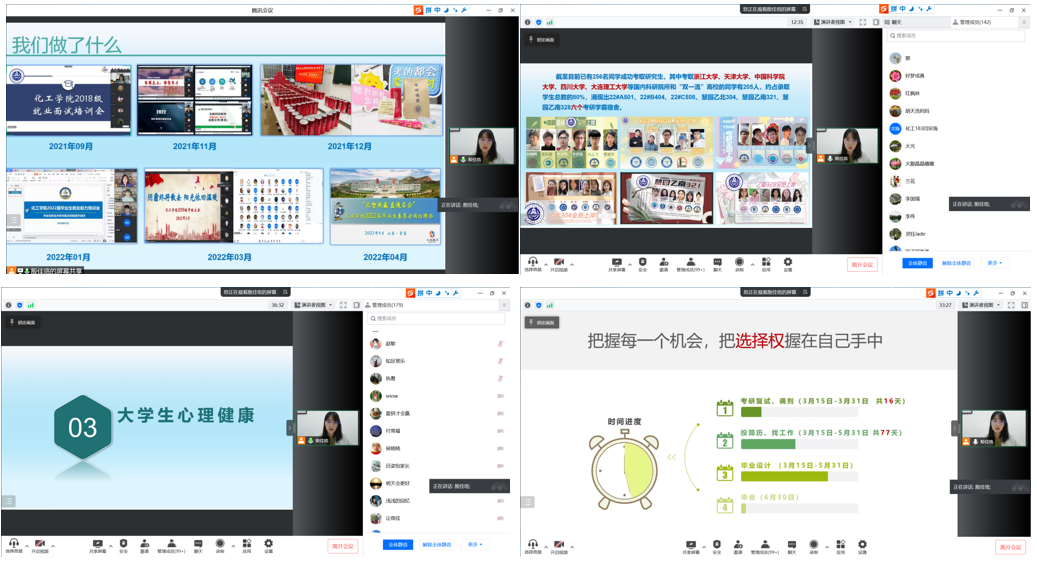 为切实做好疫情防控形势下毕业年级学生的考研就业、心理健康以及毕业季期间的服务管理工作。5月7日下午,化工学院2018级开展“云端携手,家校同心——2018级家长交流会”。辅导员殷佳珞及2018级学生家长通过腾讯会议线上参会。
