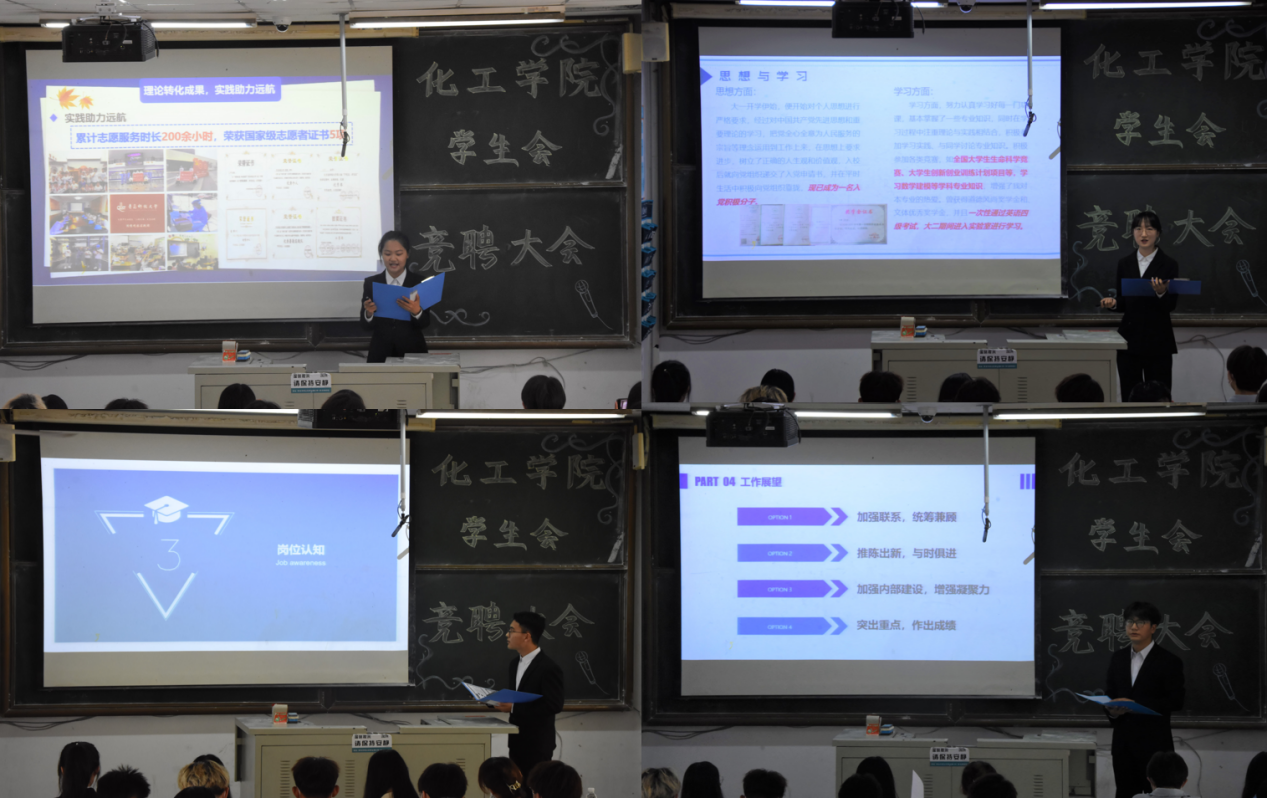 参加此次学生会竞聘的共有28名同学,在竞聘过程中,每位选手都自信地走上演讲台进行三分钟答辩和PPT展示,就各自的基本情况、对工作岗位的认识、竞选原因以及工作设想进行了演讲,他们语言自然流畅,仪态端庄大方,充分表达了自己对于学生会的认识以及无论自己是否当选都会以积极的态度面对各项活动,从他们的表现中,我们看到了化工学院学生会朝气蓬勃的未来。台下的观众同学们也倾情助阵,为略显紧张的同学们加油鼓劲,场面和谐融洽。本次学生会竞聘工作在竞选者们出色的演讲中落下帷幕,竞选结果将于近期进行公布。
