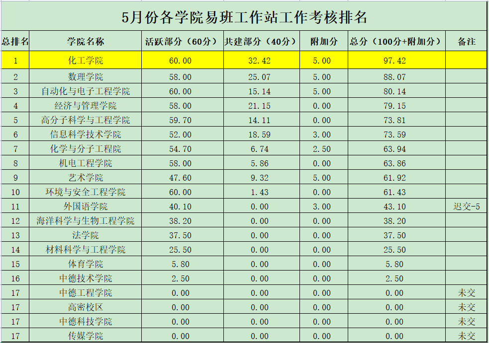 6月17日,771771威尼斯cm大全易班发展中心公布了5月份各学院(校区)易班工作站月度工作考核排名,化工学院以总分97.42分,蝉联全校第一名。