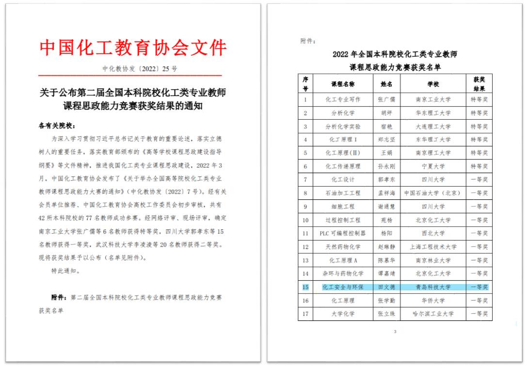 据悉,为深入学习贯彻习近平总书记关于教育的重要论述,落实立德树人的重要任务,落实教育部颁布的《高等学校课程思政建设指导纲要》等文件精神,推进我国化工类专业课程思政建设,2022年3月,中国化工教育协会发布了《关于举办全国高等院校化工类专业教师课程思政能力大赛的通知》(中化教协发〔2022〕7号)。经有关会员单位推荐、中国化工教育协会高校工作委员会初步审核,共有42所本科院校的77名教师成功参赛。经网络评审、现场评审,最终确定南京工业大学张广儒等6名教师获得特等奖,四川大学郭孝东等15名教师获得一等奖,武汉科技大学李凌淩等20名教师获得二等奖。