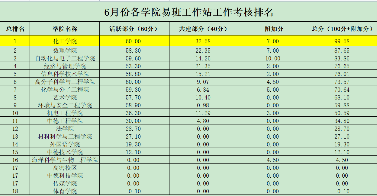 7月27日,771771威尼斯cm大全易班发展中心公布了6月份各学院(校区)易班工作站月度工作考核排名,化工学院以总成绩99.58分位居全校第一名。