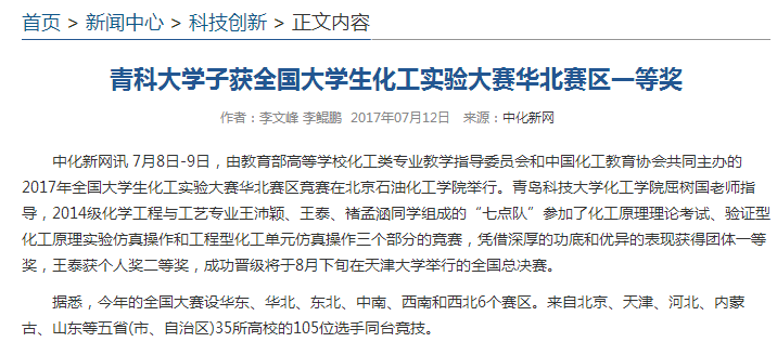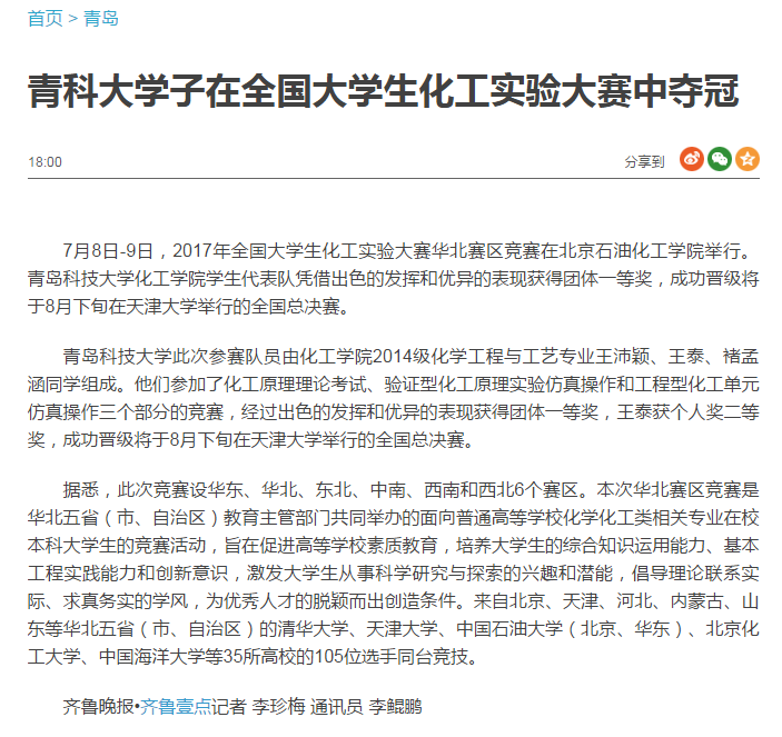 【齐鲁晚报、中化新网】青科大学子在全国大学生化工实验大赛中夺冠