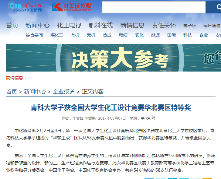 【中国化工报】青科大学子获全国化工设计竞赛华北赛区特等奖