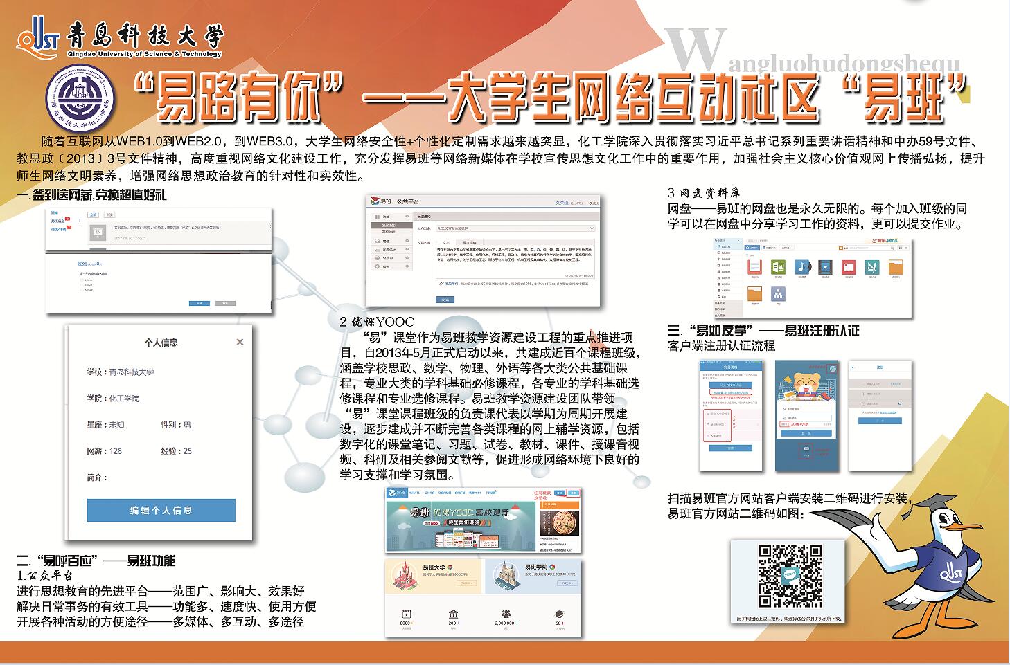 据了解,本次展板设计分为“学院概况”、“专业介绍”、“新生辅导员寄语”、“科技创新概况”、“学生工作概况”、“学生会、社团概况”、“资深学长伴学计划概况”、“安全教育指南”、“大学生易班”、“手绘校园地图”等板块。学院概况:介绍了学院的总体情况、师资队伍、人才培养、学科建设、对外交流与合作、学生教育管理等方面的成绩。专业介绍:介绍了各专业的培养目标和就业情况。新生辅导员寄语:介绍了2017级新生辅导员的基本信息和对新生的寄语。科技创新概况:介绍了学院科技创新工作的举措及取得的成绩。学生工作概况:介绍了学院在文体活动、宿舍建设、社会实践、志愿服务等方面取得的成绩。学生会、社团概况:介绍了学生会各职能部门和各学生社团情况。资深学长伴学计划概况:介绍了实施带班学长的意义、人员构成、主要工作。安全教育指南:介绍了新生应该注意的宿舍安全和人身安全。大学生易班:介绍了易班的功能以及如何注册认证。