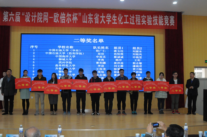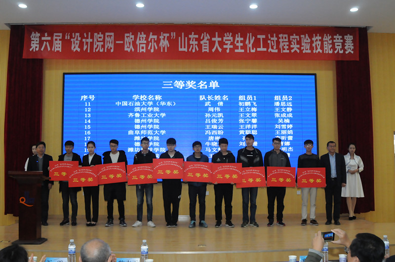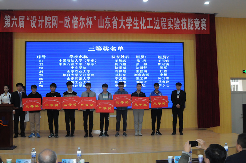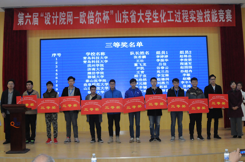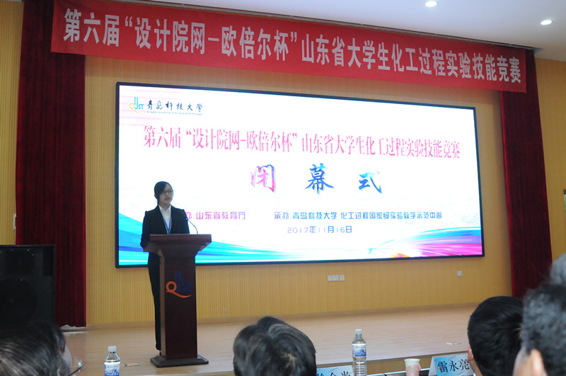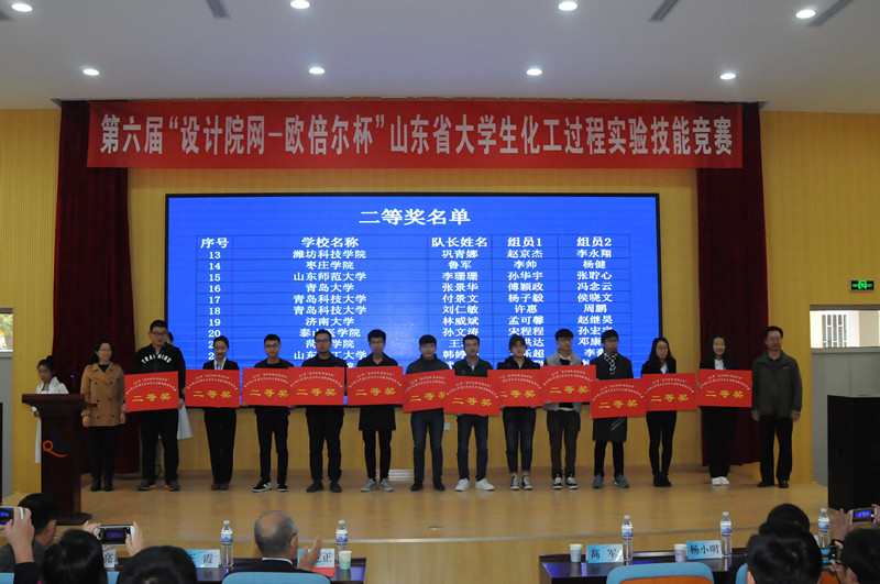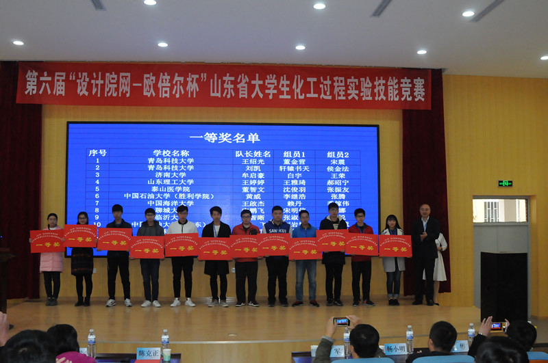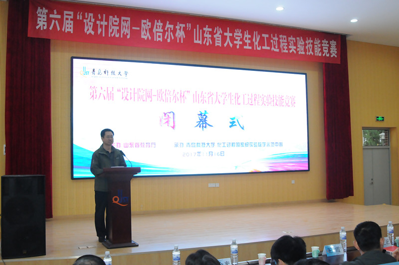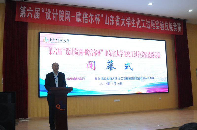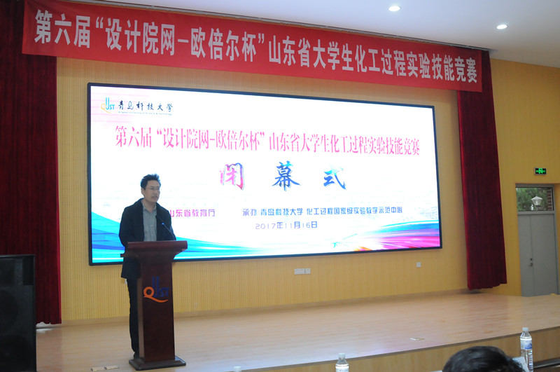 11月16日上午,“设计院网-欧倍尔杯”第六届山东省大学生化工过程实验技能竞赛闭幕式在四方校区讲学厅隆重举行。学校党委常委、副校长陈克正,专家组组长、山东科技大学博士生导师高军,学校教务处王霞,国有资产与实验室管理处副处长雷永亮,团委副书记杨小明,青岛泰捷网络科技有限公司总经理徐金光,北京欧倍尔软件技术开发有限公司总经理彭彬,以及化工学院党政领导出席会议。会议由学生处处长陈刚主持。