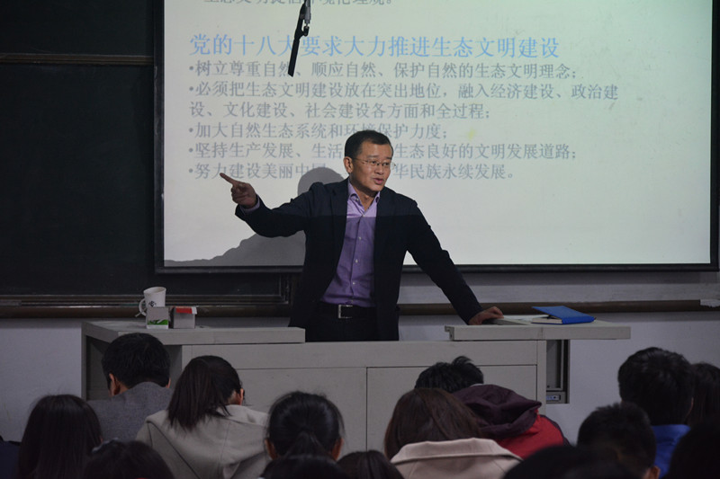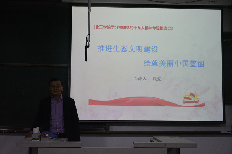11月21日下午,化工学院在四方校区一号教学楼203教室举行“推动生态文明建设,绘就美丽中国蓝图”十九大主题报告会。化工学院党总支书记钱翌作为主讲嘉宾。化工学院党总支副书记孙明媚、各教工党支部书记及支委会成员、全体学生党员聆听报告会。