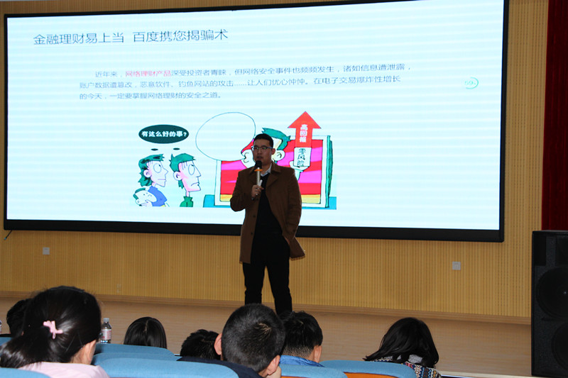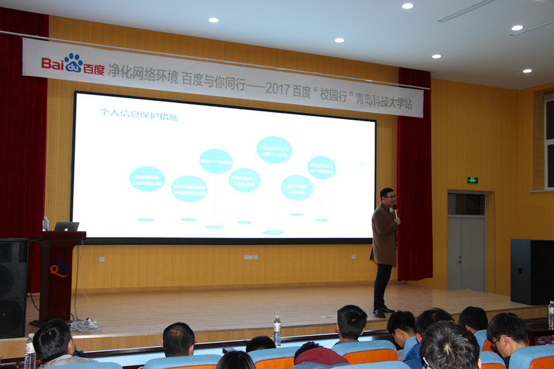 首先,李方超从百度内容安全中心简介、网络信息环境、网络安全基础知识、远离网络暴力、网络诈骗案例、网络诈骗防骗招式等方面向同学们进行了详细讲解,他指出,互联网日趋深度的融入我们的生活,带给我们更丰富体验和可能的同时,也蕴藏着“危机”,校园贷风波、兼职招聘诈骗、助学贷诈骗事件、传销组织以及其他涉黄、涉赌等网络不良信息危害大学生身心健康,甚至导致上当受骗,走向违法犯罪的道路。随后,详细介绍了百度内容安全中心,致力于建立互联网安全新生态,旨在通过采用系统巡查和人工巡查并举的手段,维护互联网清朗环境。于海燕从百度(青岛)智创基地、百度人工智能发展现状等方面进行了详细介绍。她指出,百度(青岛)智创基地是一个旨在全力打造一个基于AI人工智能的全产业链创业生态圈和“创新创业创投”服务平台,并向大家讲述了《百度AI生态伙伴计划》。