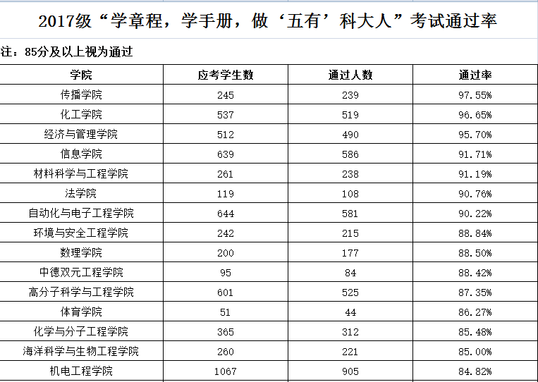 12月26日,学校公布《2017级“学章程,学手册,做‘五有’科大人”考试通过率通报》,化工学院通过率为96.65%,位居全校第二名。
