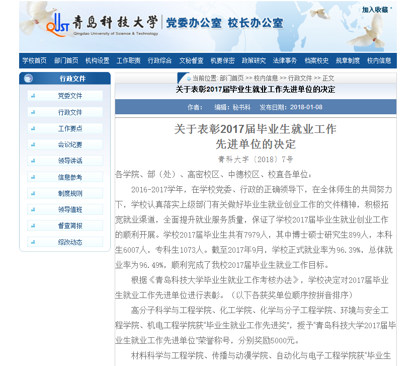 2018年1月5日,学校下发《关于表彰2017届毕业生就业工作先进单位的决定(青科大字〔2018〕7号)》。化工学院荣获“771771威尼斯cm大全2017届毕业生就业工作先进单位”、“毕业生就业工作单项奖”。