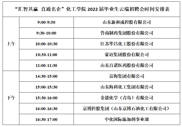 为更好地搭建毕业生与优质用人单位的双选平台,促进毕业生更充分更高质量就业,化工学院将于11月27日于线上举办“汇智共赢 直通名企”2022届毕业生云端招聘会,此次招聘会共邀请了中化集团、京博控股集团、鲁南制药集团等10家省内外优质石油石化、化工制药类企业,欢迎广大同学积极参与。